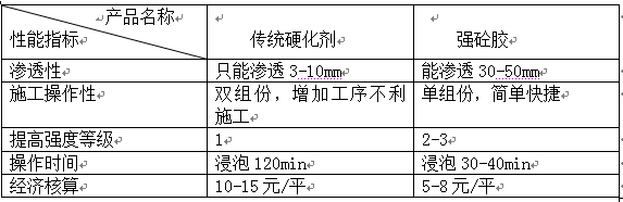 强砼胶是我公司生产的混凝土硬化材料,它克服了以往材料渗透力不强、仅是表面固化、双组份不利施工等缺点;有效渗透到水泥基地面内部,与混凝土深度反应固化,大幅度提高水泥基地面的面层强度、硬度和耐磨性能,达到不起砂、不起灰的效果,能承受大型车辆频繁行走。